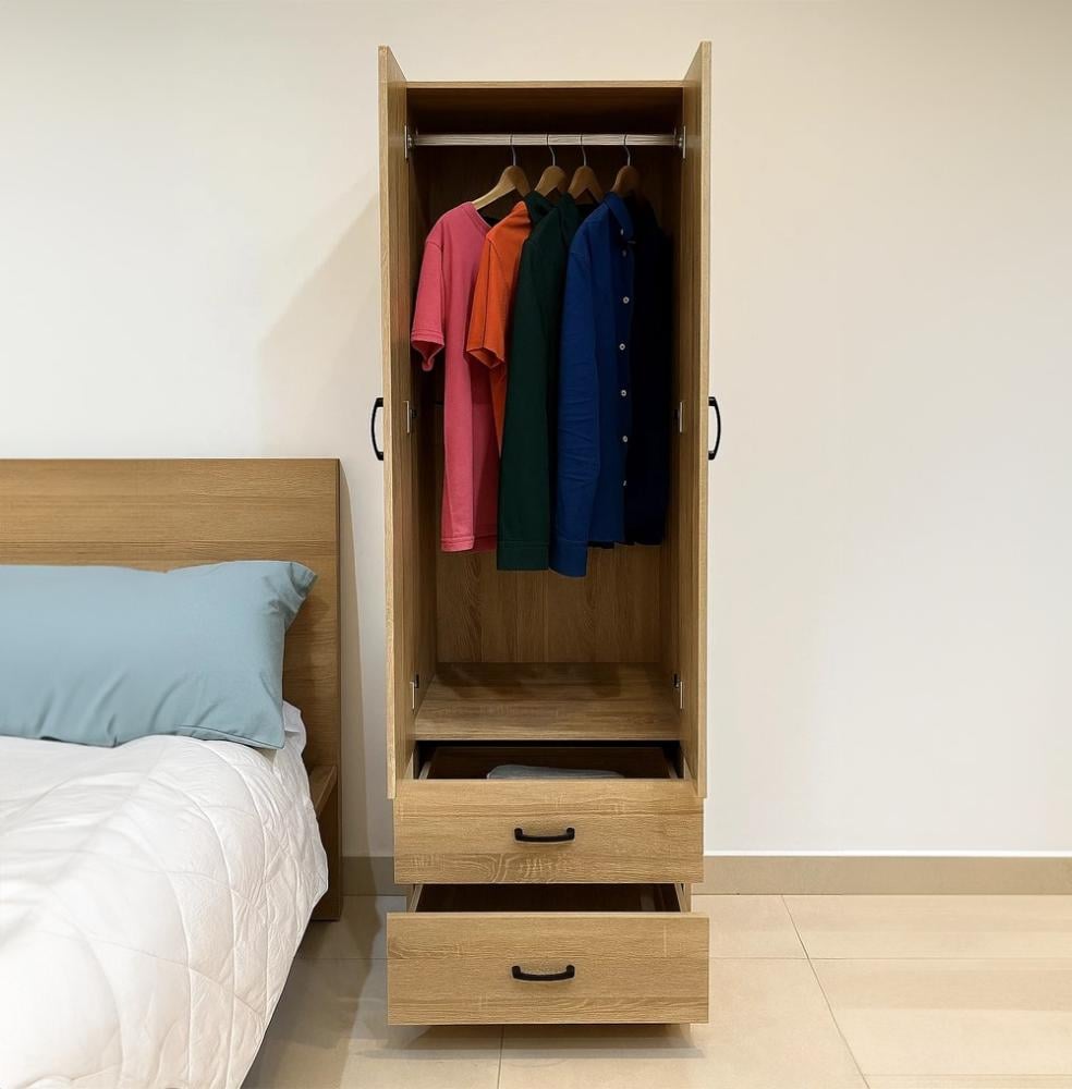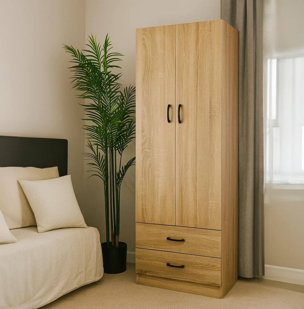٧٠٠دولاب خشبي عملي بلون خشبي بتصميم بسيط وأنيق يناسب غرف النوم والمساحات الصغيرة. يحتوي على بابين للملابس مع درجين سفليين بيد معدنية قوية، مما يوفر مساحة تخزين منظمة وأسلوب راقٍ لديكور منزلك.
